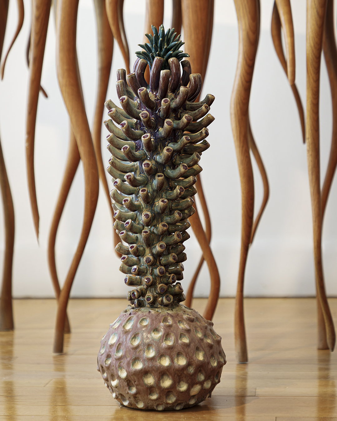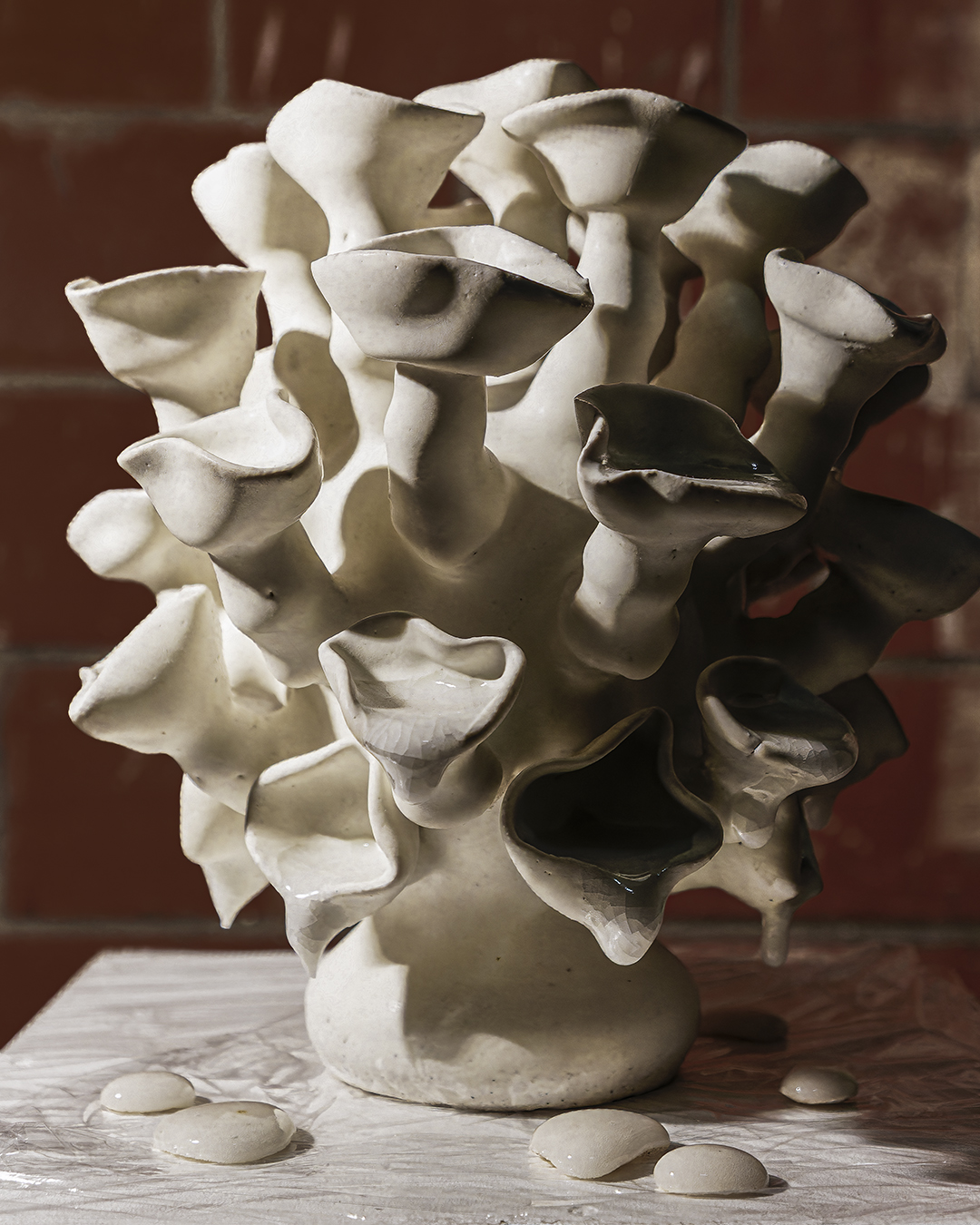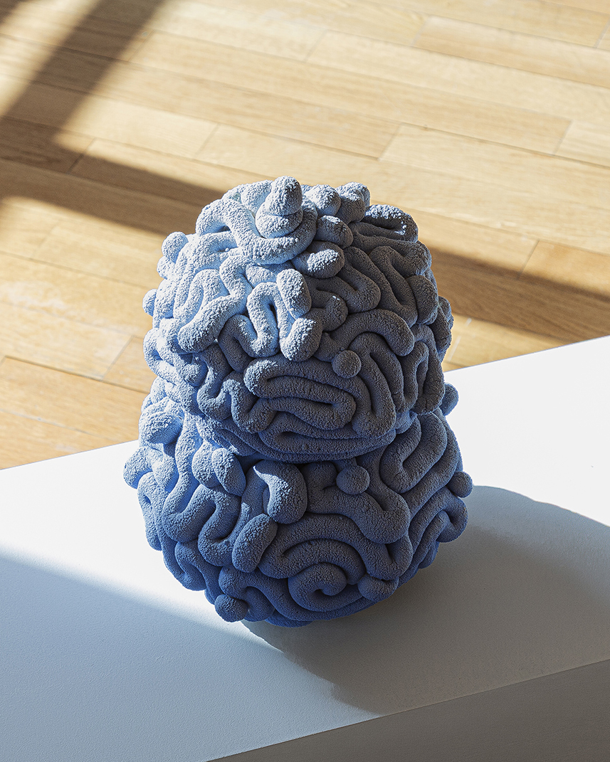 She creates a biomorphic universe inspired by plants, aquatic elements, and the human body. Her sculptures are organic presences evolving in an imaginary garden. They build a personal mythology where the boundaries between the human body and the living world become porous. Through this work, she tries to make visible the intimate connection between inside and outside, between the individual and a larger living world.