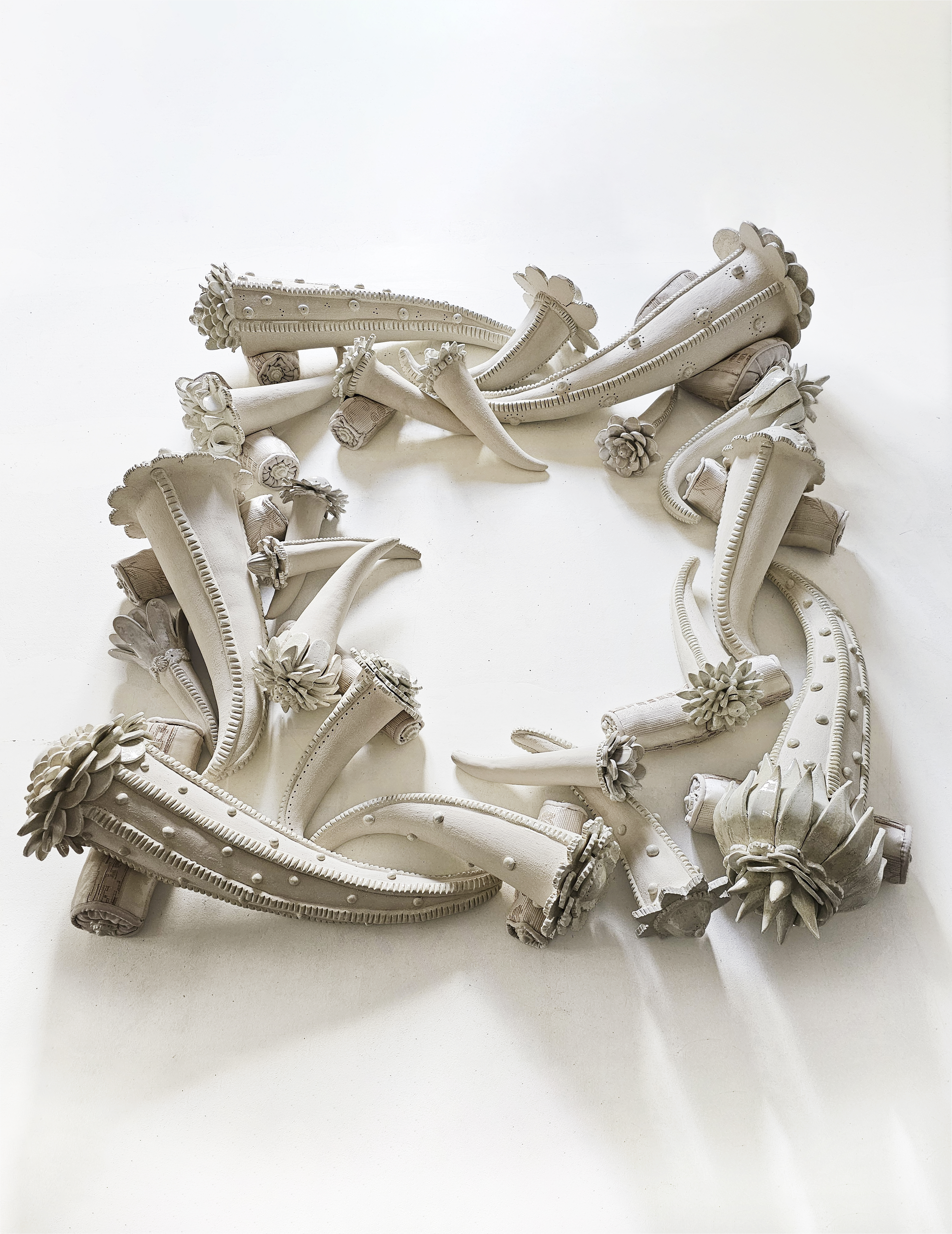 Fleury is equally fond of spreading her large pieces horizontally as she is of raising them vertically into enchanted columns in her Totem series. She is exhibiting with Galerie Analora at the international fair Ceramic Brussels 2026. Her totem, Black is Black, features velvety black skin enhanced by obsidian-like beads and adorned with arabesques resembling truncated capitals, hemmed with braids or rubber tire-track textures. Humor is always there, lurking beneath the surface. Similarly, her piece Les Endormies, arranged in a circle on the floor, recalls in both subject and white palette her work Succulentes, which was exhibited in Portugal in 2023 near the work of Joana Vasconcelos. In place of the crawling, interlocking ivory cacti with their blossoming porcelain flowers—at once prickly and swollen like fruit—we find an accumulation of cornucopias and cones with corollas that are simultaneously suave and bristling. The Rococo is close at hand in Les Endormies: the powdered white of Madame de Pompadour, satins, pâte sablée, and snowy stucco—a whole spectrum of whites, occasionally highlighted with gold or silver. Yet, the artist never forgets to corset her chiseled works, infusing them with a poisonous edge to avoid any hint of mawkishness.